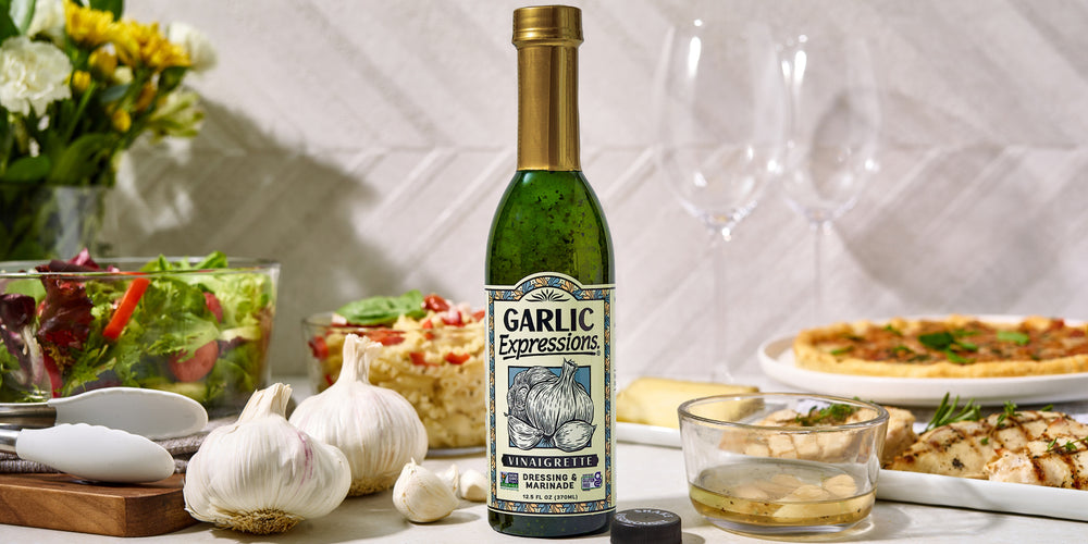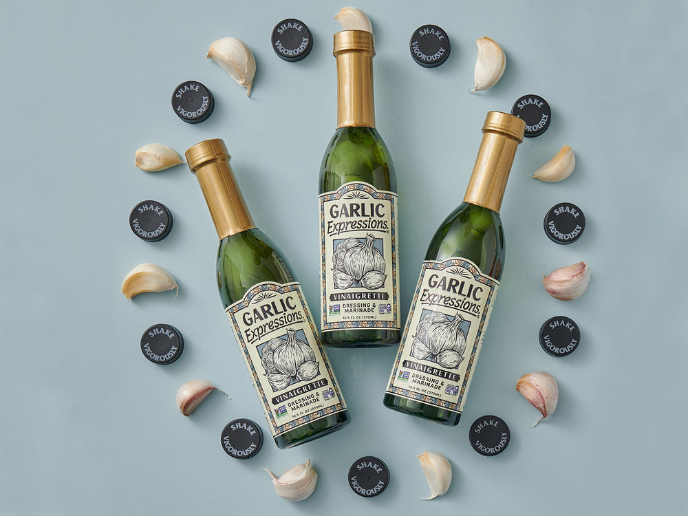 Garlic Expressions is a vinaigrette dressing fused with hand-sorted, pickled garlic cloves, vegan and allergen-free.