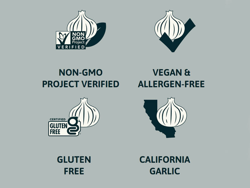 We acquire the highest quality garlic from the prime growing region of California. Each garlic clove is sized and qualified by hand to meet our quality threshold. This process enables us to develop a subtle, yet full-flavored garlic taste that doesn’t overwhelm the other ingredients. Nearly all other products use dried or dehydrated garlic that zaps the full garlic flavor. We’ve chosen the difficult method of only using fresh garlic.Clean Ingredients Fit Dietary Restrictions of All Kinds